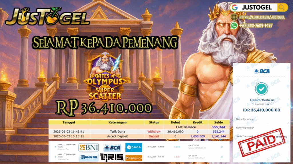Selamat kepada User ID : ANG**T4 Telah berhasil mendapatkan kemenangan besar pada Permainan JP SLOT GATES OF OLYMPUS SUPER SCATTER Dengan kemenangan Sebesar Rp 36.410.000,- Setelah mengisi formulir withdraw dengan kurung waktu hanya 5-10 menit pihak JUSTOGEL sudah melakukan transfer kepada pemilik User ID dan dana sudah dapat di cairkan oleh pemenang. Bukti pembayaran yang kami berikan merupakan bukti pembayaran yang SAH / VALID yang langung di dapatkan melaui tanda transfer transaksi dari Bank yang di tuju.