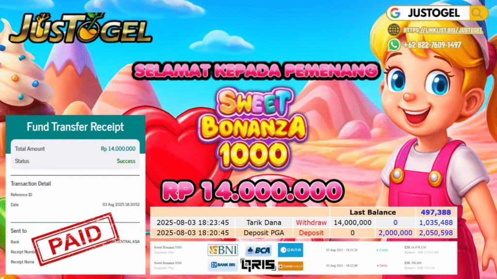 Selamat kepada User ID : GIJ***SL0 Telah berhasil mendapatkan kemenangan besar pada Permainan JP SLOT SWEET BONANZA 1000 Dengan kemenangan Sebesar Rp 14.000.000,- Setelah mengisi formulir withdraw dengan kurung waktu hanya 5-10 menit pihak JUSTOGEL sudah melakukan transfer kepada pemilik User ID dan dana sudah dapat di cairkan oleh pemenang. Bukti pembayaran yang kami berikan merupakan bukti pembayaran yang SAH / VALID yang langung di dapatkan melaui tanda transfer transaksi dari Bank yang di tuju.