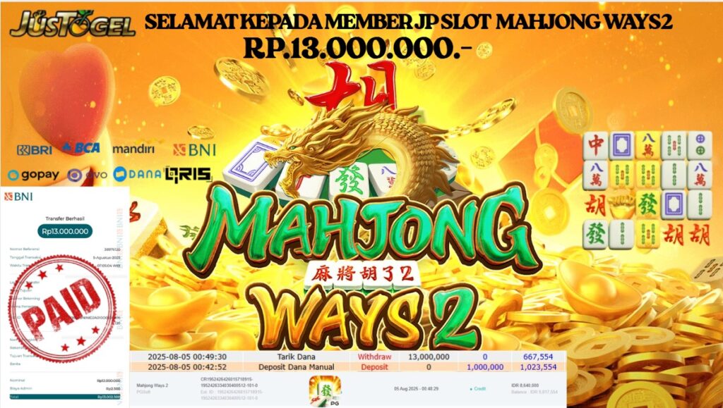 Selamat kepada User ID : JIN***88 Telah berhasil mendapatkan kemenangan besar pada Permainan JP SLOT MAHJONG WAYS2 Dengan kemenangan Sebesar Rp 13.000.000,- Setelah mengisi formulir withdraw dengan kurung waktu hanya 5-10 menit pihak JUSTOGEL sudah melakukan transfer kepada pemilik User ID dan dana sudah dapat di cairkan oleh pemenang. Bukti pembayaran yang kami berikan merupakan bukti pembayaran yang SAH / VALID yang langung di dapatkan melaui tanda transfer transaksi dari Bank yang di tuju.