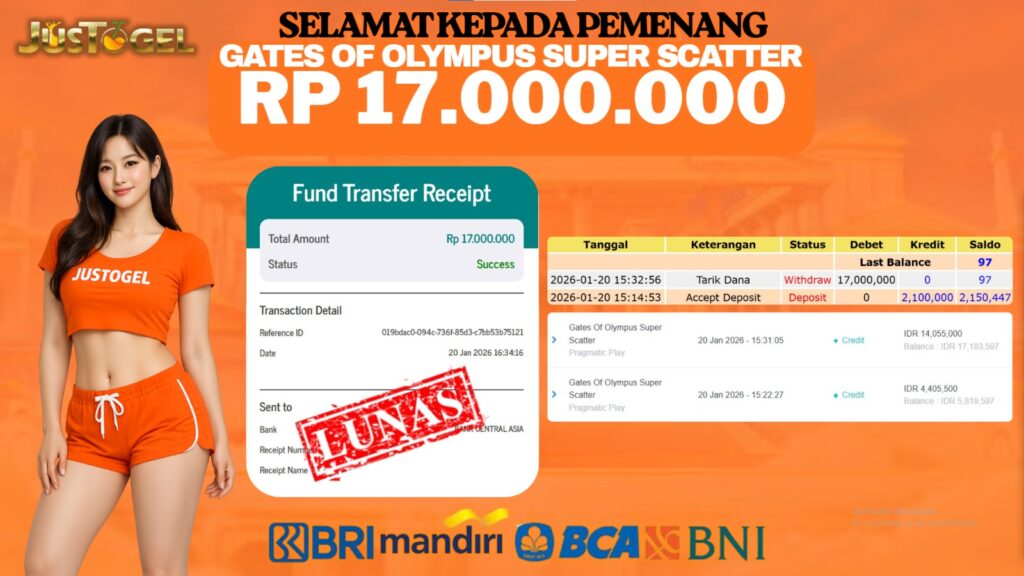 Selamat kepada User ID : SHIS***YOR4 Telah berhasil mendapatkan kemenangan besar pada Permainan JP SLOT GATES OF OLYMPUS SUPER SCATTER Dengan kemenangan Sebesar Rp. 17.000.000,- Setelah mengisi formulir withdraw dengan kurung waktu hanya 5-10 menit pihak JUSTOGEL sudah melakukan transfer kepada pemilik User ID dan dana sudah dapat di cairkan oleh pemenang. Bukti pembayaran yang kami berikan merupakan bukti pembayaran yang SAH / VALID yang langung di dapatkan melaui tanda transfer transaksi dari Bank yang di tuju.