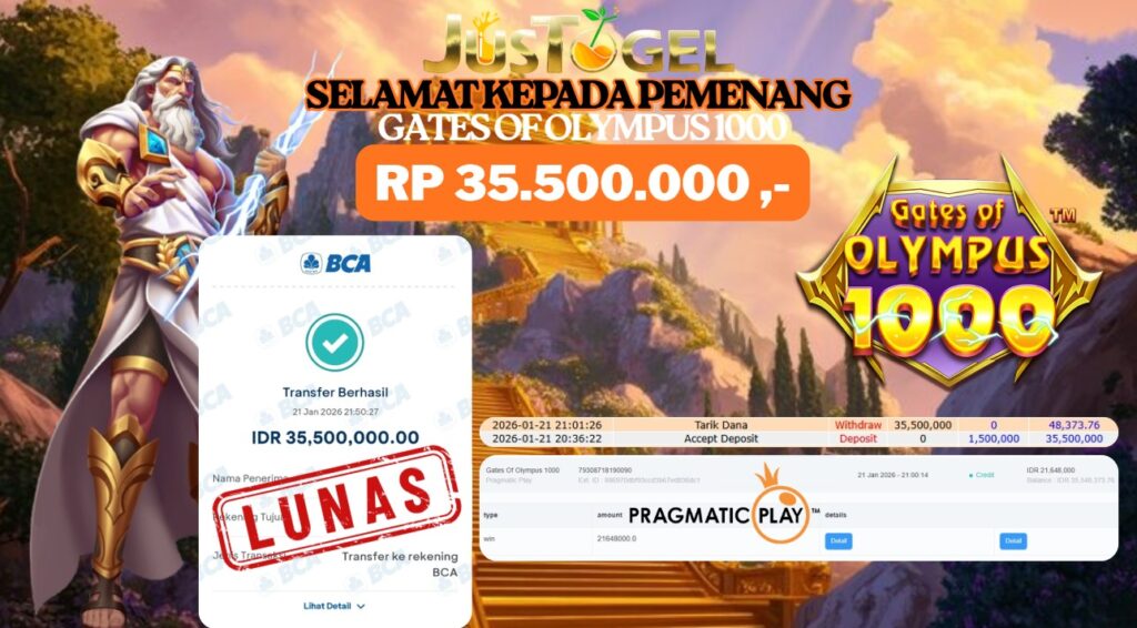 Selamat kepada User ID : YUS***NIK00 Telah berhasil mendapatkan kemenangan besar pada Permainan JP SLOT GATES OF OLYMPUS 1000 Dengan kemenangan Sebesar Rp. 35.500.000 ,- Setelah mengisi formulir withdraw dengan kurung waktu hanya 5-10 menit pihak JUSTOGEL sudah melakukan transfer kepada pemilik User ID dan dana sudah dapat di cairkan oleh pemenang. Bukti pembayaran yang kami berikan merupakan bukti pembayaran yang SAH / VALID yang langung di dapatkan melaui tanda transfer transaksi dari Bank yang di tuju.
