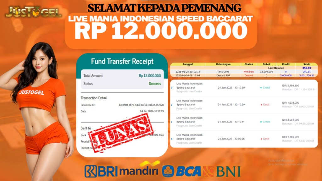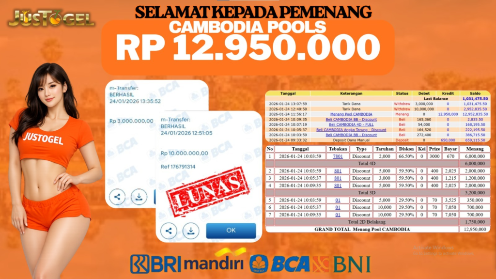 Selamat kepada User ID : TRI***999 Telah berhasil mendapatkan kemenangan besar pada Permainan JP TOGEL CAMBODIA POOLS Dengan kemenangan Sebesar Rp. 12.950.000,- Setelah mengisi formulir withdraw dengan kurung waktu hanya 5-10 menit pihak JUSTOGEL sudah melakukan transfer kepada pemilik User ID dan dana sudah dapat di cairkan oleh pemenang. Bukti pembayaran yang kami berikan merupakan bukti pembayaran yang SAH / VALID yang langung di dapatkan melaui tanda transfer transaksi dari Bank yang di tuju.