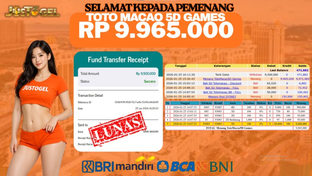 Selamat kepada User ID : JAS***UUU3 Telah berhasil mendapatkan kemenangan besar pada Permainan JP TOGEL TOTO MACAO 5D GAMES Dengan kemenangan Sebesar Rp. 9.965.000,- Setelah mengisi formulir withdraw dengan kurung waktu hanya 5-10 menit pihak JUSTOGEL sudah melakukan transfer kepada pemilik User ID dan dana sudah dapat di cairkan oleh pemenang. Bukti pembayaran yang kami berikan merupakan bukti pembayaran yang SAH / VALID yang langung di dapatkan melaui tanda transfer transaksi dari Bank yang di tuju.