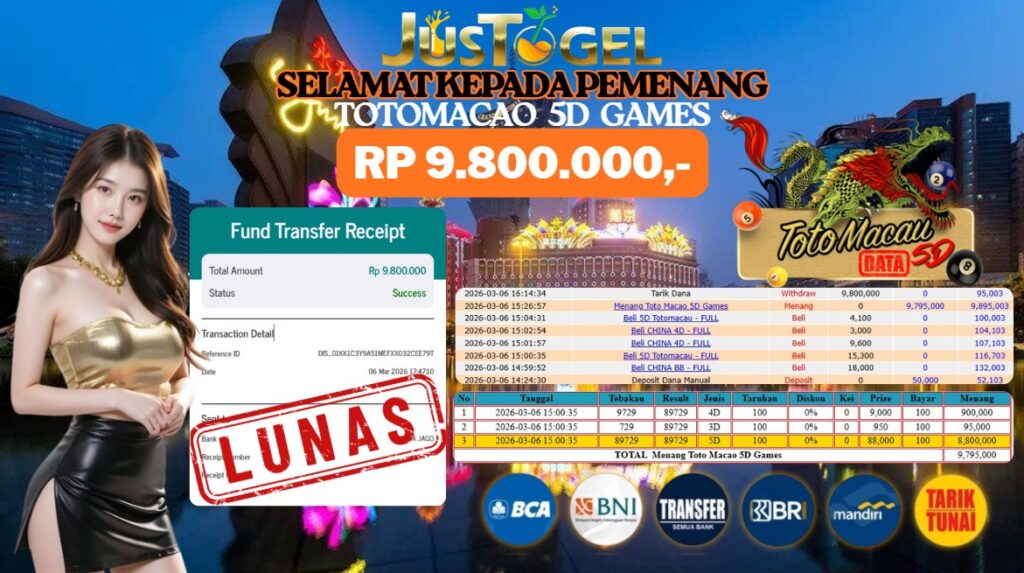 Selamat kepada User ID : DDD***M11TK Telah berhasil mendapatkan kemenangan besar pada Permainan JP TOGEL TOTOMACAO 5D GAMES Dengan kemenangan Sebesar Rp. 9.800.000,- Setelah mengisi formulir withdraw dengan kurung waktu hanya 5-10 menit pihak JUSTOGEL sudah melakukan transfer kepada pemilik User ID dan dana sudah dapat di cairkan oleh pemenang. Bukti pembayaran yang kami berikan merupakan bukti pembayaran yang SAH / VALID yang langung di dapatkan melaui tanda transfer transaksi dari Bank yang di tuju.