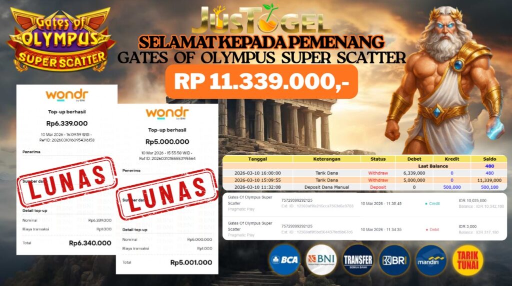 Selamat kepada User ID : BUN***SMPT56 Telah berhasil mendapatkan kemenangan besar pada Permainan JP SLOT GATES OF OLYMPUS SUPER SCATTER Dengan kemenangan Sebesar Rp. 11.339.000,- Setelah mengisi formulir withdraw dengan kurung waktu hanya 5-10 menit pihak JUSTOGEL sudah melakukan transfer kepada pemilik User ID dan dana sudah dapat di cairkan oleh pemenang. Bukti pembayaran yang kami berikan merupakan bukti pembayaran yang SAH / VALID yang langung di dapatkan melaui tanda transfer transaksi dari Bank yang di tuju.
