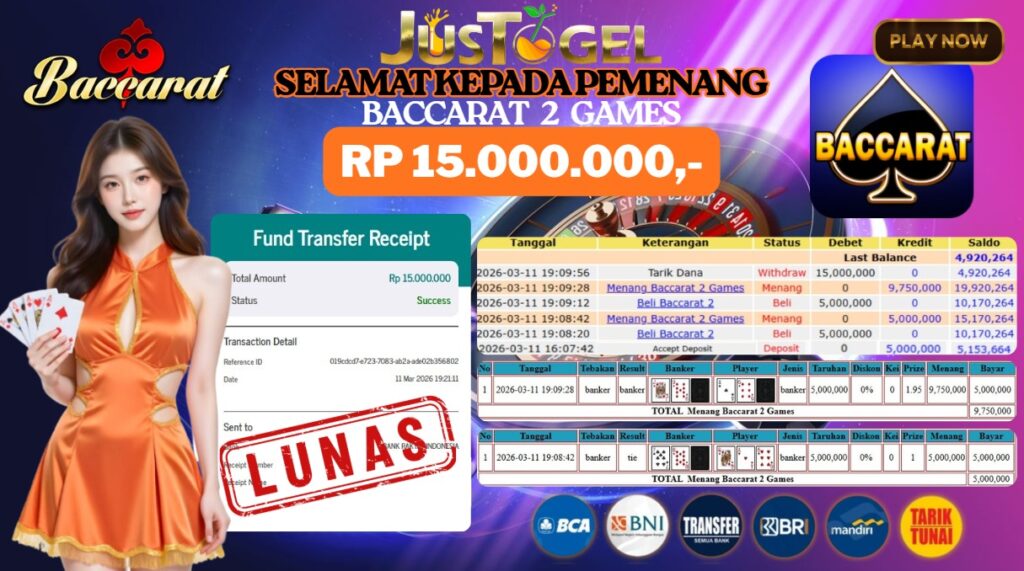 Selamat kepada User ID : PTR***M4LUU Telah berhasil mendapatkan kemenangan besar pada Permainan JP LIVE GAME BACCARAT 2 GAMES Dengan kemenangan Sebesar Rp. 15.000.000,- Setelah mengisi formulir withdraw dengan kurung waktu hanya 5-10 menit pihak JUSTOGEL sudah melakukan transfer kepada pemilik User ID dan dana sudah dapat di cairkan oleh pemenang. Bukti pembayaran yang kami berikan merupakan bukti pembayaran yang SAH / VALID yang langung di dapatkan melaui tanda transfer transaksi dari Bank yang di tuju.