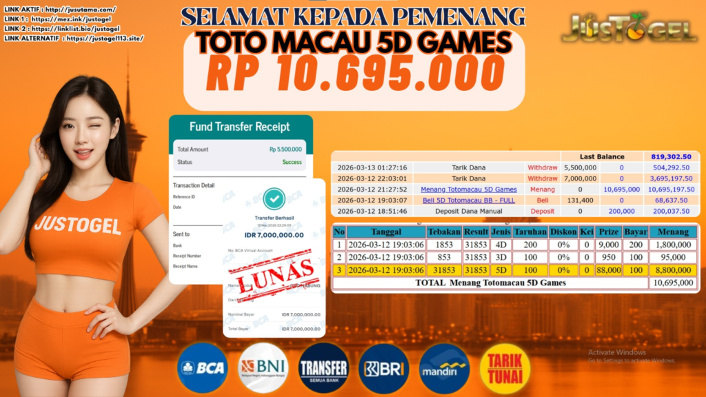 Selamat kepada User ID : VIE***ANSI Telah berhasil mendapatkan kemenangan besar pada Permainan JP TOGEL TOTO MACAU 5D Dengan kemenangan Sebesar Rp. 10.695.000,- Setelah mengisi formulir withdraw dengan kurung waktu hanya 5-10 menit pihak JUSTOGEL sudah melakukan transfer kepada pemilik User ID dan dana sudah dapat di cairkan oleh pemenang. Bukti pembayaran yang kami berikan merupakan bukti pembayaran yang SAH / VALID yang langung di dapatkan melaui tanda transfer transaksi dari Bank yang di tuju.