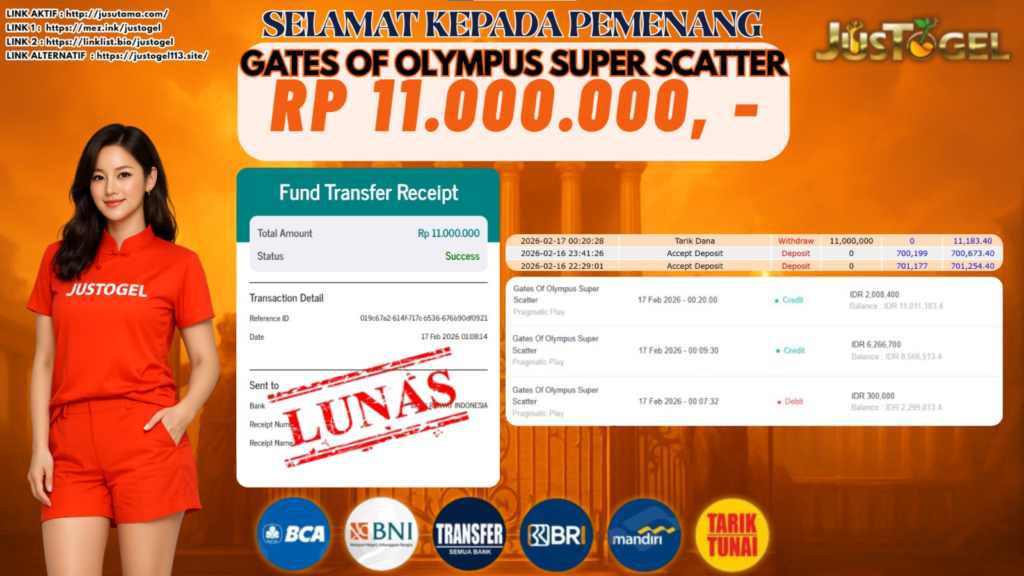 Selamat kepada User ID : LON***RUTAL Telah berhasil mendapatkan kemenangan besar pada Permainan JP SLOT GATES OF OLYMPUS SUPER SCATTER Dengan kemenangan Sebesar Rp. 11.000.000,- Setelah mengisi formulir withdraw dengan kurung waktu hanya 5-10 menit pihak JUSTOGEL sudah melakukan transfer kepada pemilik User ID dan dana sudah dapat di cairkan oleh pemenang. Bukti pembayaran yang kami berikan merupakan bukti pembayaran yang SAH / VALID yang langung di dapatkan melaui tanda transfer transaksi dari Bank yang di tuju.